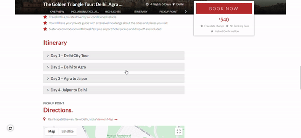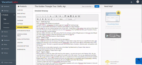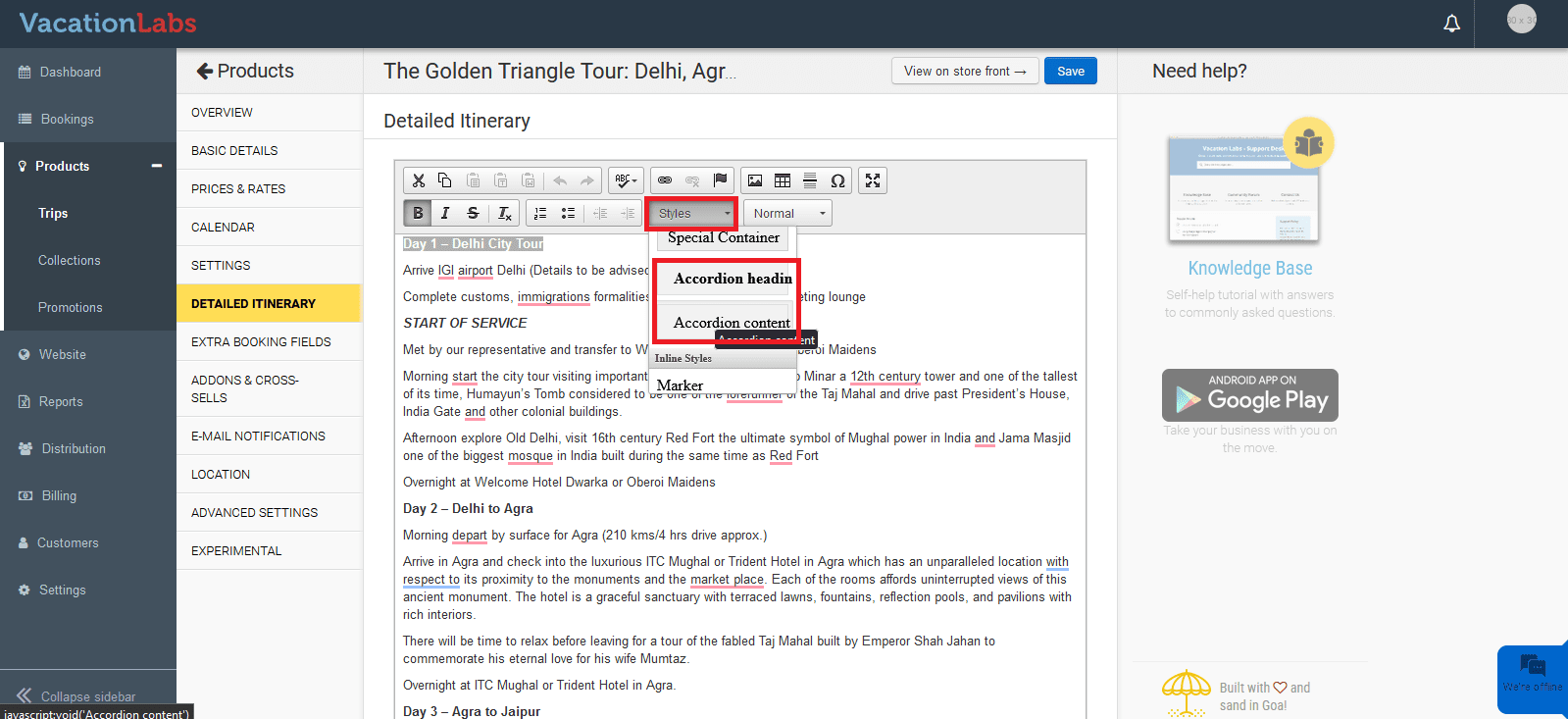 For example, if you want to set it up in the Itinerary section, navigate to Products > Trips > Edit trips > Detailed Itinerary. Here, add the content and select the text that will be displayed as a heading. Then, choose the styles option and select “Accordion heading”. For the content, select the content text and from the styles option, choose “Accordion content” and Save the changes.