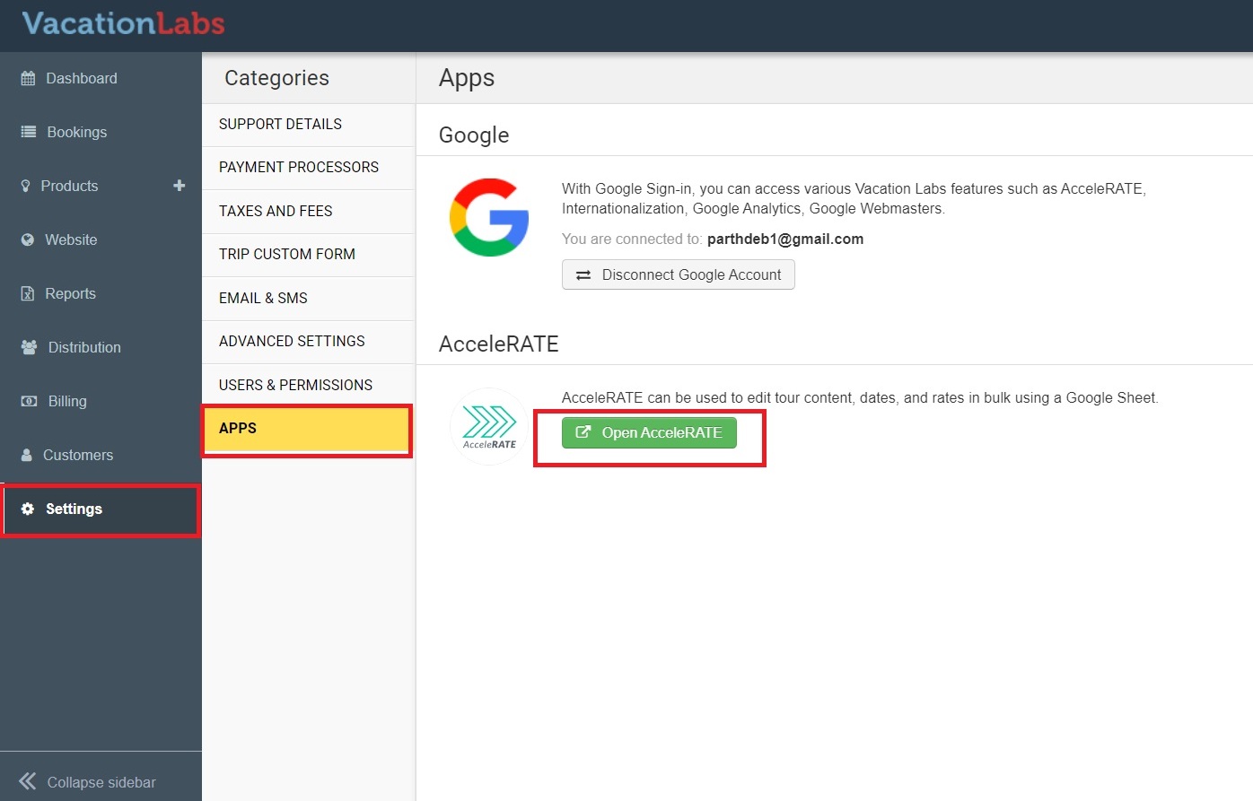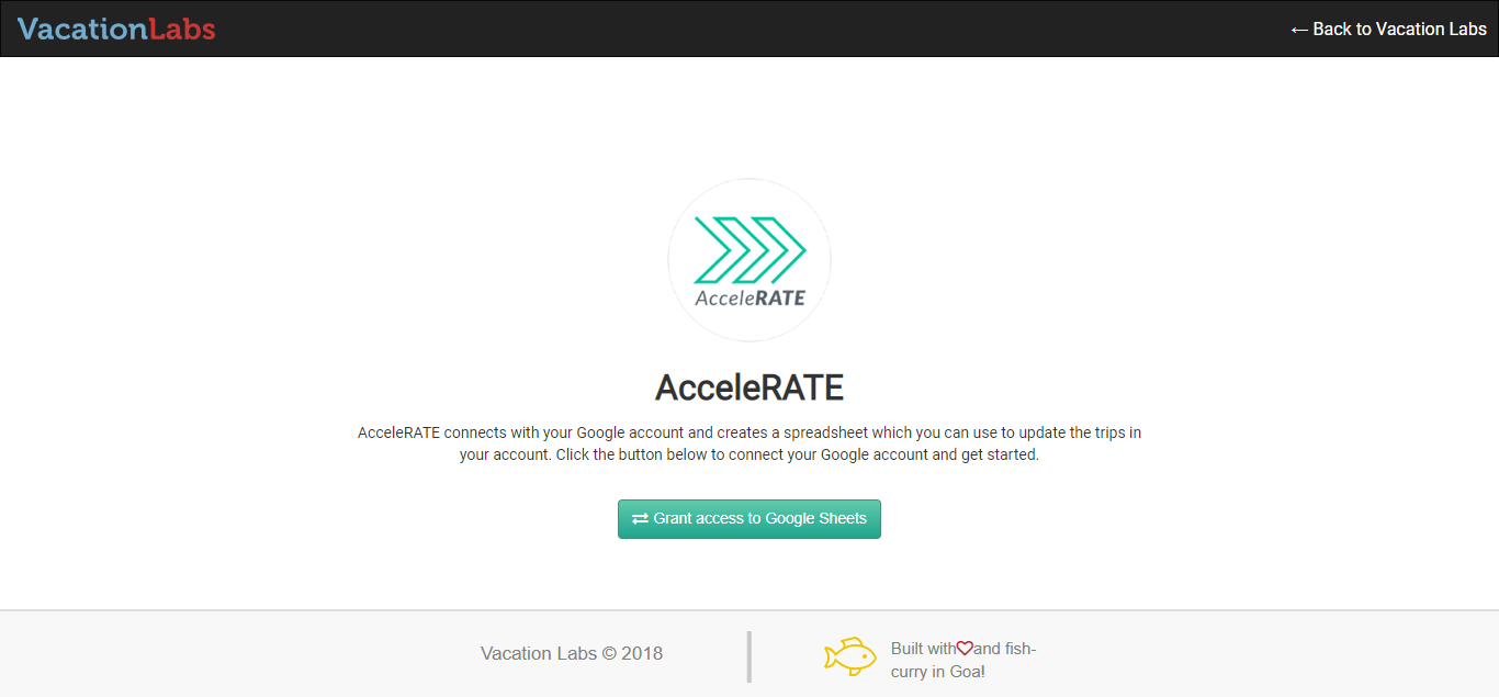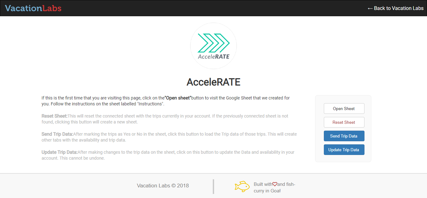 Accelerate is a Bulk Editing Tool which allows you to modify the content, dates, and rates of multiple tours at once. This tool works by connecting your Google account with your Vacation Labs account and giving it access to your Google Drive. Accelerate creates a Google Sheet in your Google Drive which is then used to push existing content, dates, and rates of your tours into a Google Sheet and make any changes or modifications in bulk to one or multiple tours.