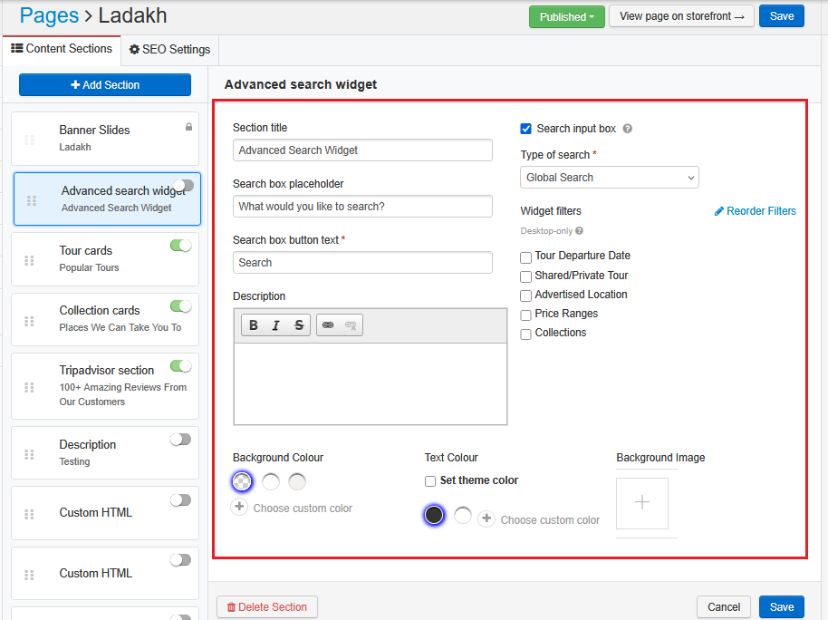 The widget will now appear in your list of sections. Turn it ON, then click on it to access settings where you can customize the background color, title, and filters.