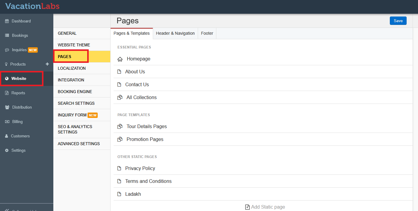 To add the Advanced Search Widget, go to Website > Pages. From the list of available pages, select the page where you’d like the widget to appear.
