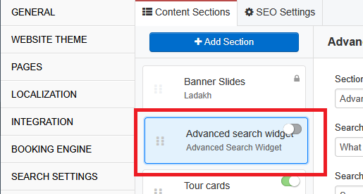 In the editor, click Add a Section, and from the dropdown, choose Advanced Search Widget.