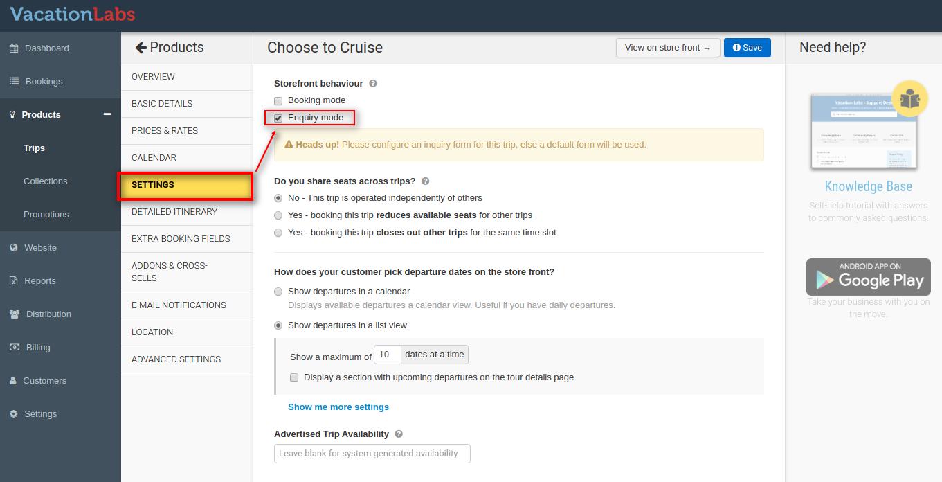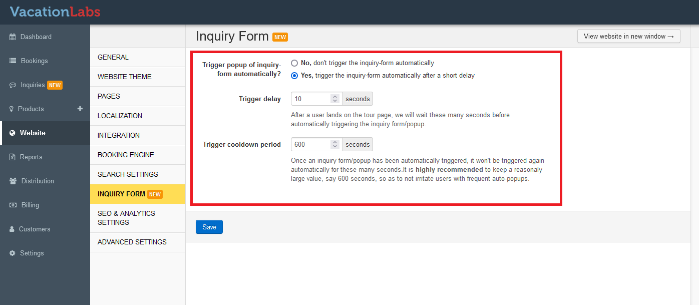 Here, select ‘Y****es, trigger the inquiry-form automatically after a short delay’, and configure the number of seconds for the trigger delay. This defines how long the system waits after a customer visits the tour details page before displaying the popup form.