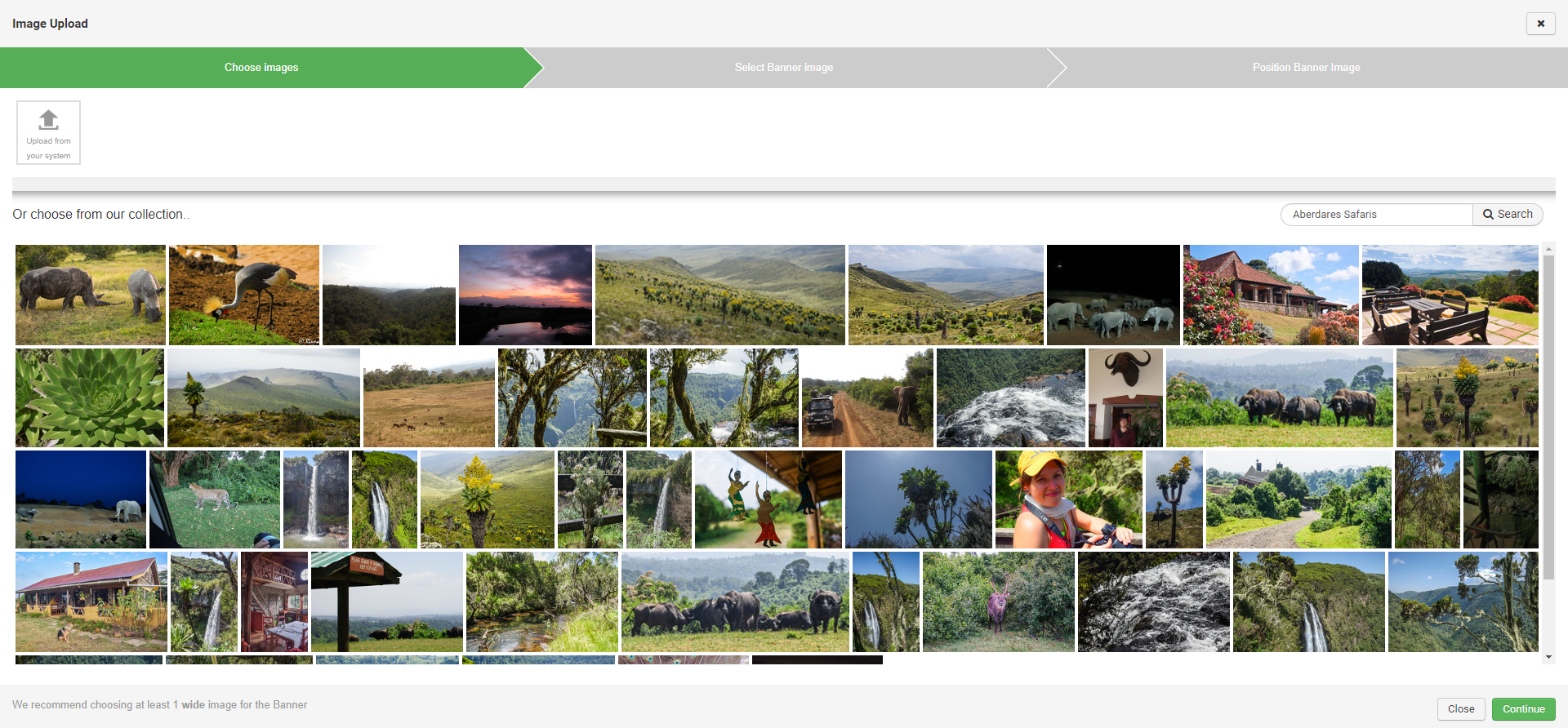 If you’re uploading from your computer, select Upload from your system and choose the images from your local device, or use the search option to find images on the internet, which will display results from our collection. After uploading, click Continue.