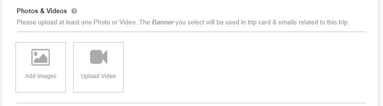 To add photos, go to Products > Trips, edit the trip, and under Basic Details scroll down to Photos & Videos, then click Add Images**