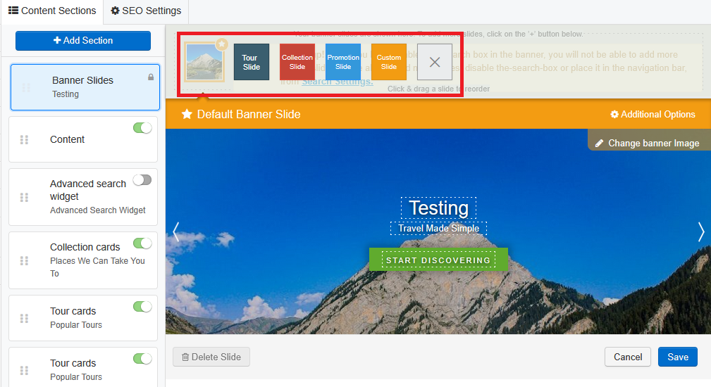 Choose the type of slider you want to display (Tour, Collection, Promotion, or Custom), edit the slide details as required, and then click Save to apply the changes