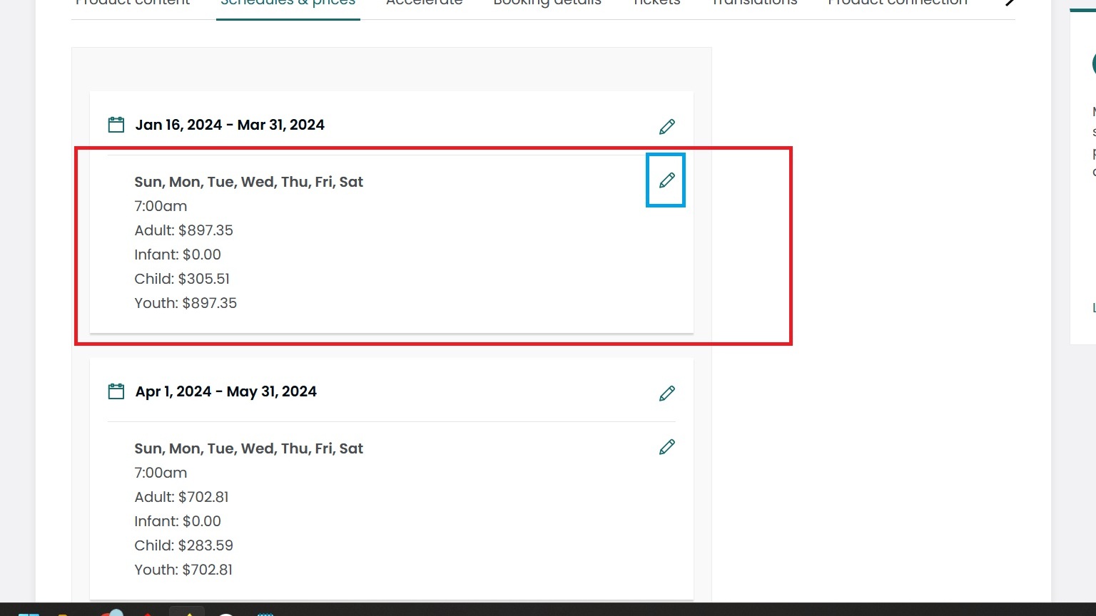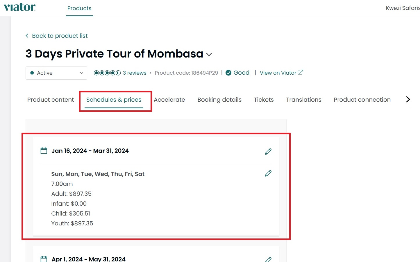 Inside the products (in Viator) there is a section called Schedules & Prices (refer screenshot below)