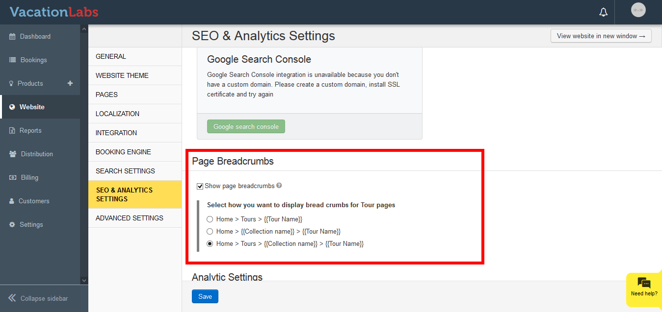 Under Page Breadcrumbs **Select how you want to display bread crumbs for Tour pages