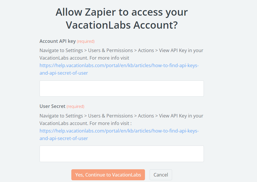 A pop will appear asking you to enter the Account API Key and User Secret along with the steps of where to get it, paste the same and click on Yes Continue to VacationLabs (refer screenshot below)