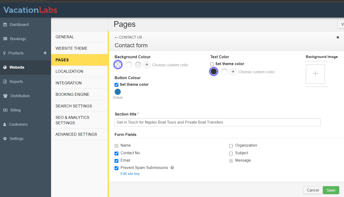 Before you are able to enable the Contact form you will need to add your Custom SMTP Details in the Vacation Labs Back office or else the system won’t allow enabling the form