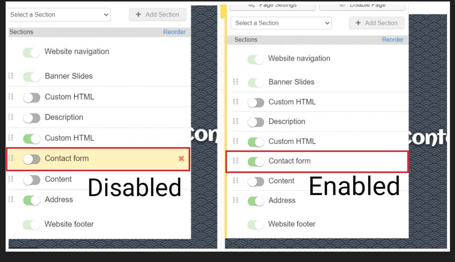 The section will be disabled by default, please toggle the button to green to enable it (refer screenshots below for reference)