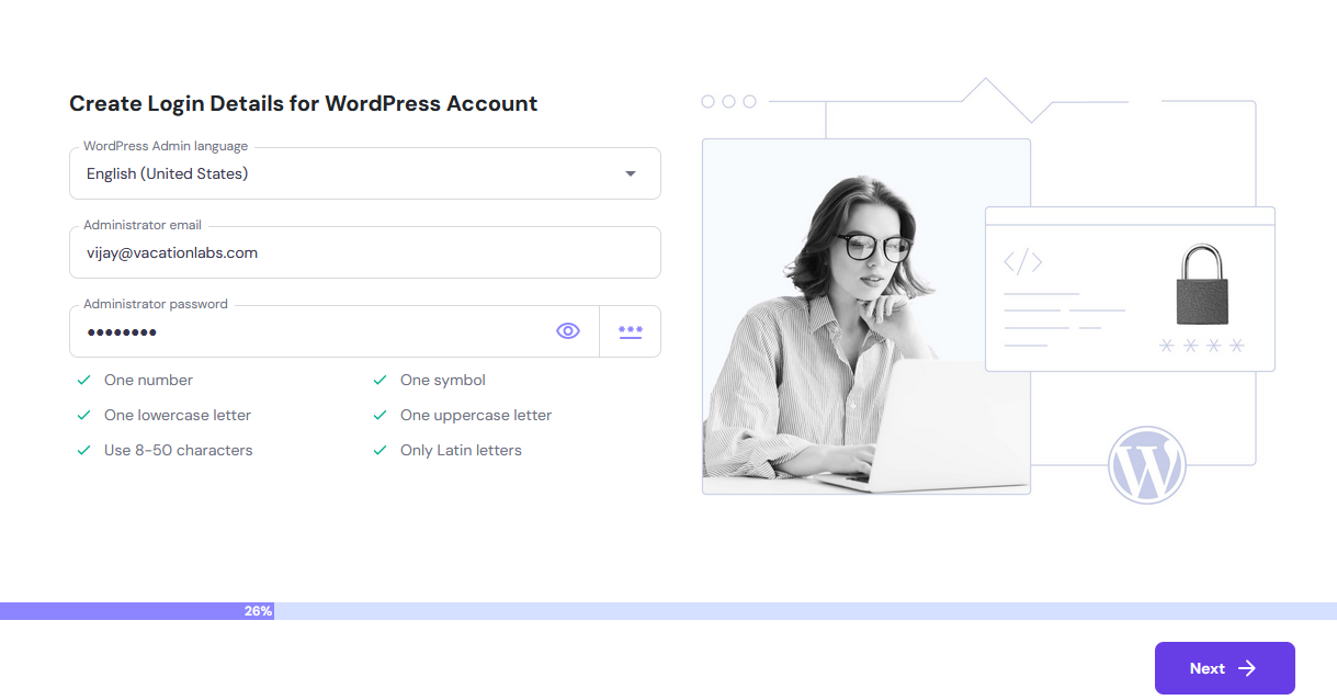 After clicking Next, WordPress will be installed on your domain. Please wait a moment for the installation to complete.