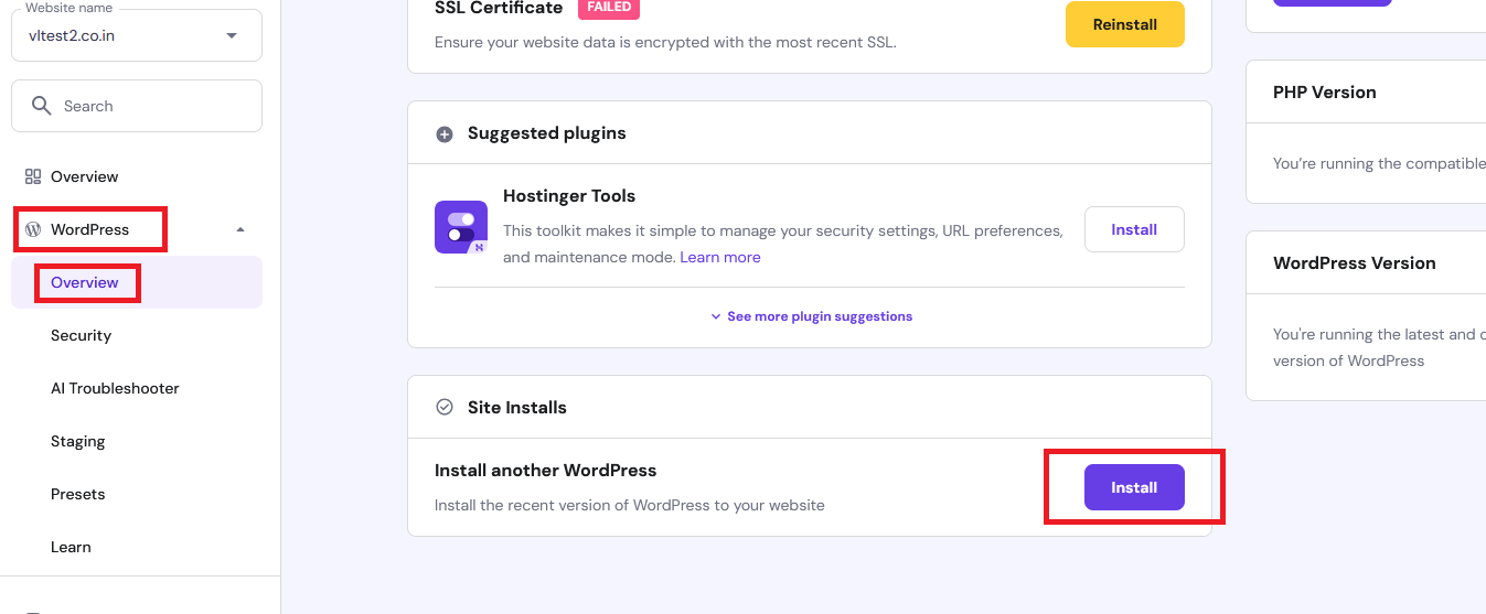 Open the dashboard and navigate to WordPress > Overview. Scroll down to the bottom, and you will find the option to “Install Another WordPress.” Click the install button.