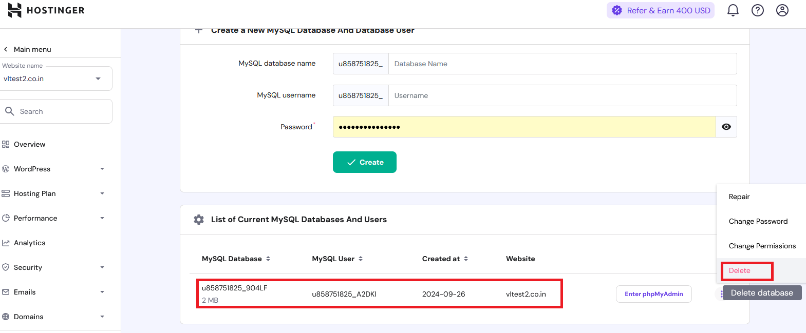 Navigate back to the dashboard, click on “Database,” and delete the previously created database.