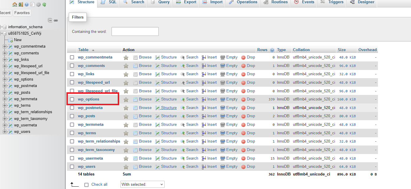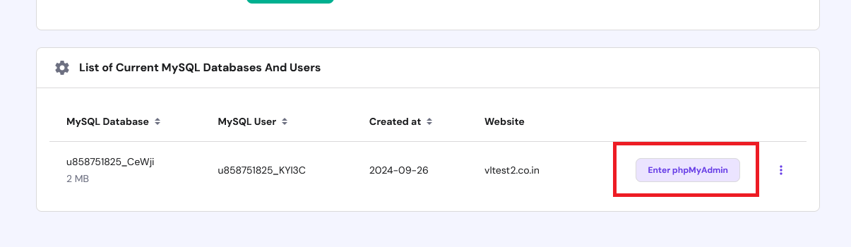 Go to the dashboard, click on “Databases,” locate the installed database, and click the “Enter phpMyAdmin” button.