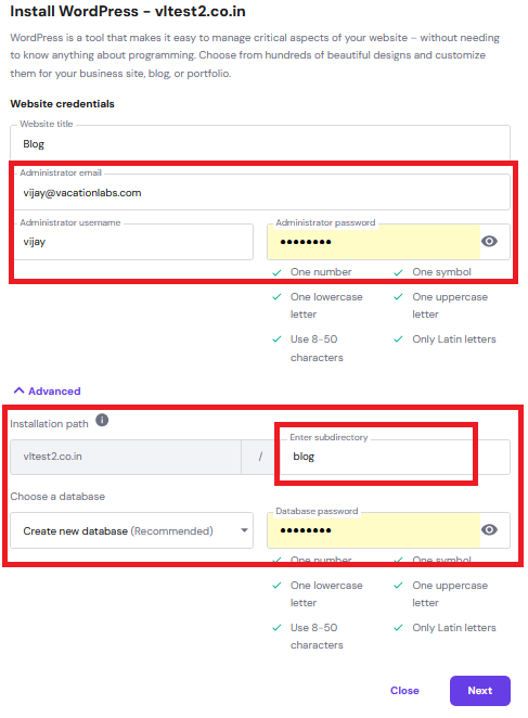 Next, create your admin username and password. Click on “Advanced,” specify the subdirectory as “blog,” and configure the database password and click on Next button.
