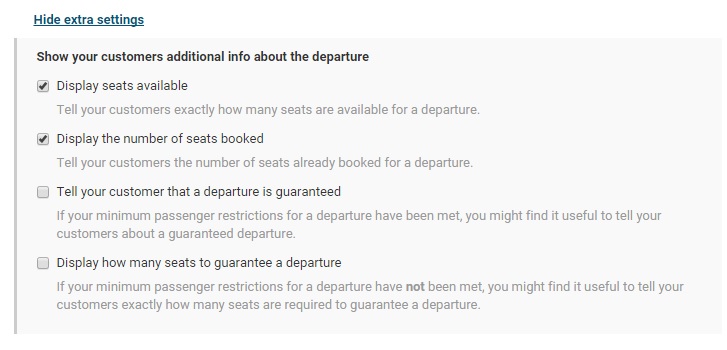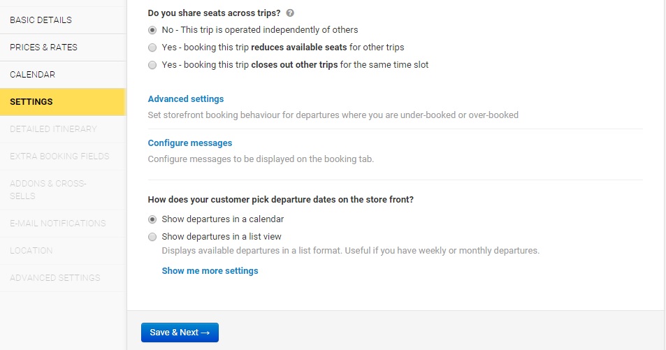 You can set the date display to customers as a calendar or list view. You can set additional departure information by clicking the ‘show more settings’ option.