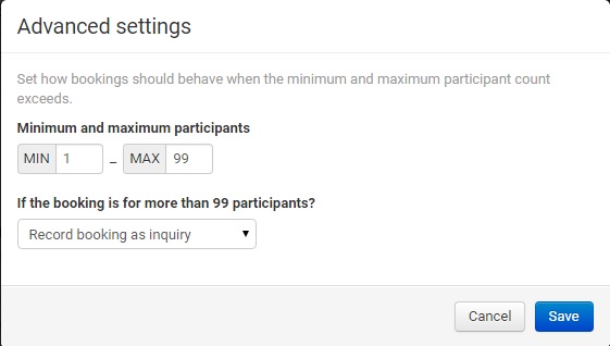 Advanced setting helps you set default behaviour if minimum number of seats is not met or maximum number is breached. You get an option to record bookings as enquiry or keep the booking as awaiting confirmation. You can also set default warning messages to be displayed in these cases.