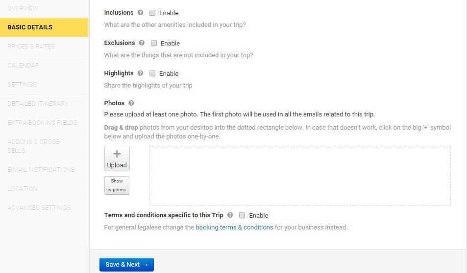 Photos section helps you add photos related to your tour/trip/activity. This helps in creating a visually attractive booking page and the right photos can set the correct expectations for the customers.