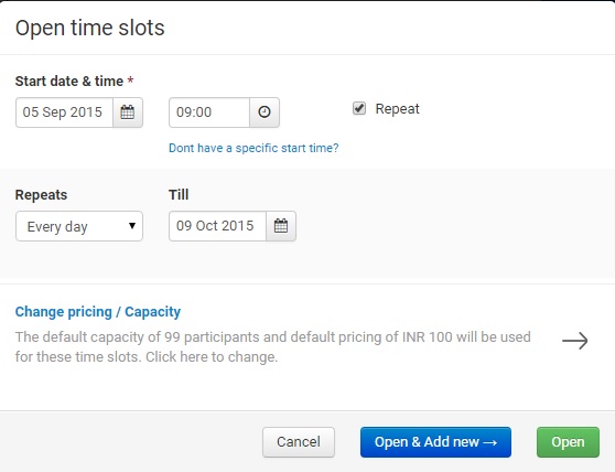 When you click on it, a pop-up window opens which helps you select a start date and time. It has a checkbox for repeating this selection for upcoming days or weeks. You can also edit the pricing and capacity that you had set in the earlier page.