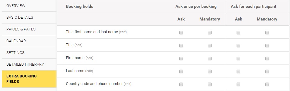 You can capture details per booking/ per participant and as optional or mandatory. You can also give out an option to sign up for your newsletter. You can use the field options that are pre-set or create your own custom fields.