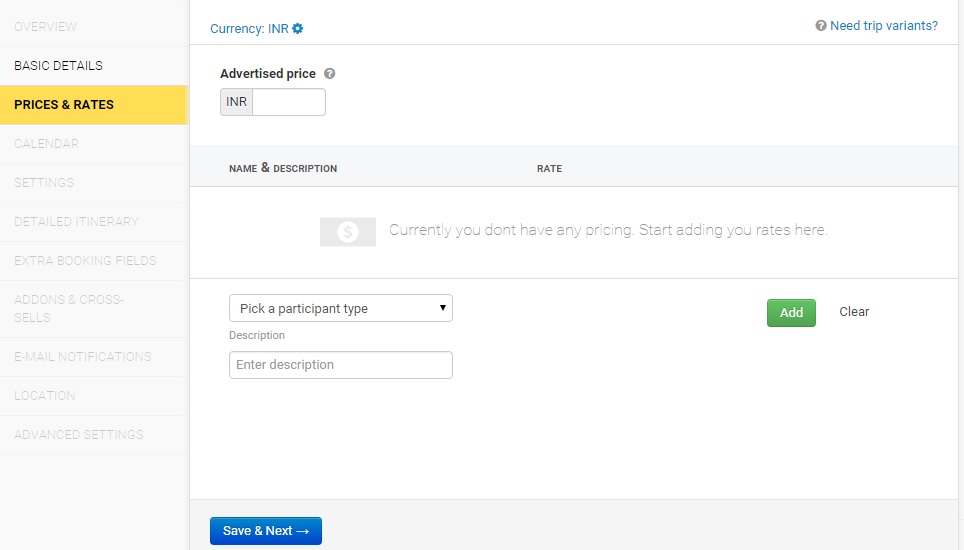 Next, you need to add rates per participant types. You can choose standard participant type from the drop down or specify a custom participant type. You can give a name to the custom participant type (Eg. Navy veteran) and enter a description for that type. (Eg. Ex service men from the Indian navy) You will also have an option of booking slots for a participant type. (Eg. A couple will occupy 2 slots)