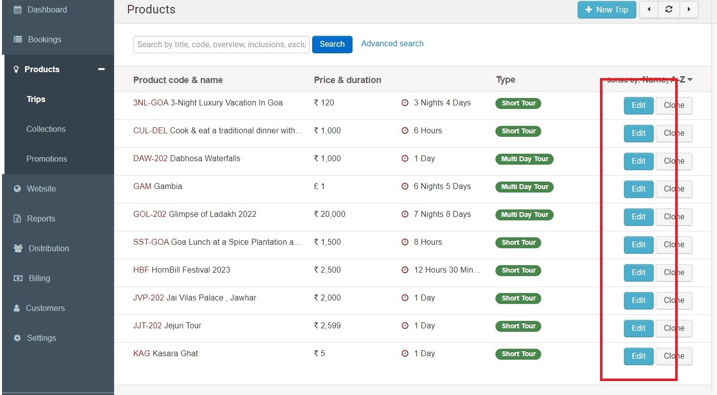 2. Click on EDIT for the Trip for which you want to hide the advertised tour price.