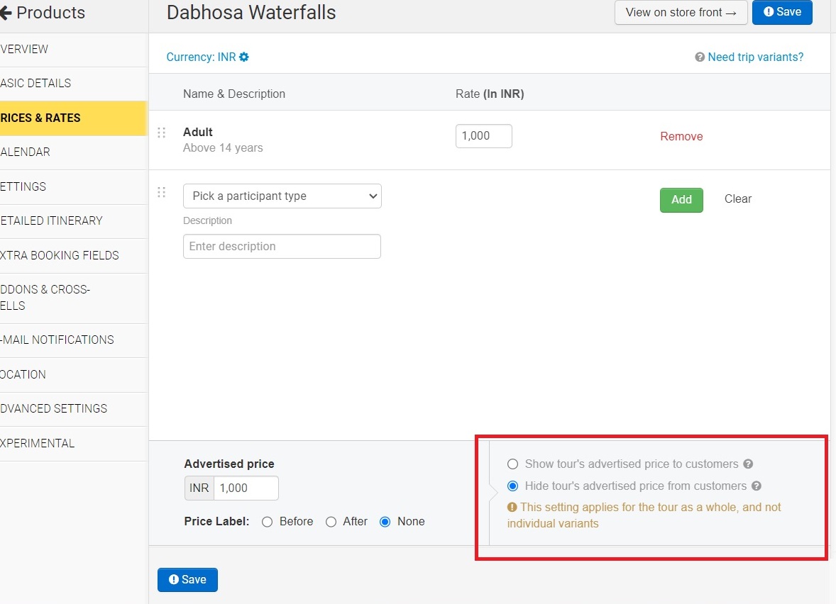 4. Here you can Select the option titled “Hide Tour’s Advertised Price from Customers” and this will hide the advertised tour price from the storefront.