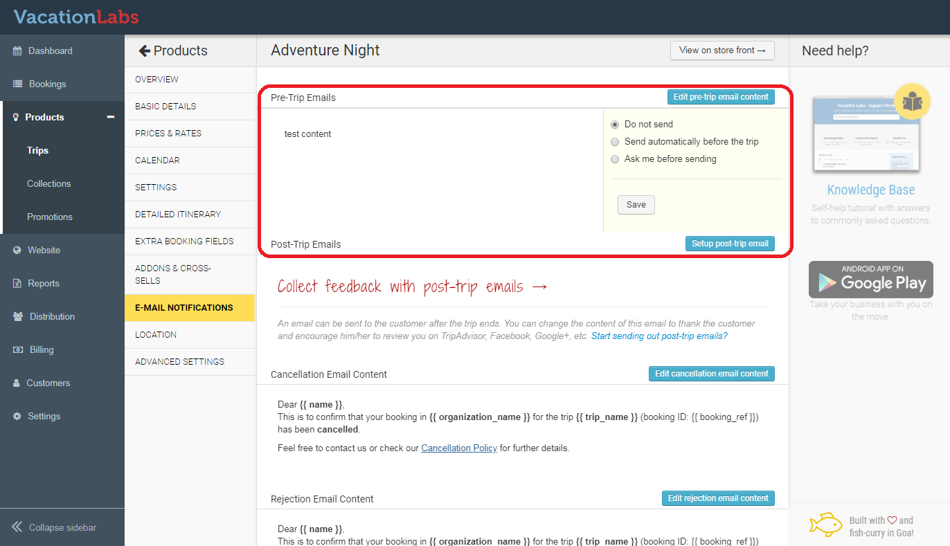 To set up a Pre-Trip email, log in to your Vacation Labs admin panel and navigate to Products > Trips. Edit the trip you want to update, then go to the Email Notifications section and select Setup Pre-Trip Email****s.