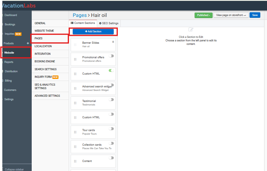 The system will automatically add your chosen section to the top of the page. Please note that for preview purposes, new sections are added in a disabled state and will not be visible on your live site yet.