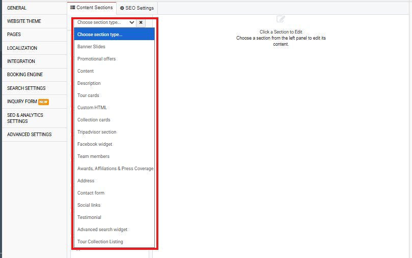 From the dropdown menu, click on the type of section you want to add (e.g., Tour Cards, Collection List, Image Banner, Contact Form).