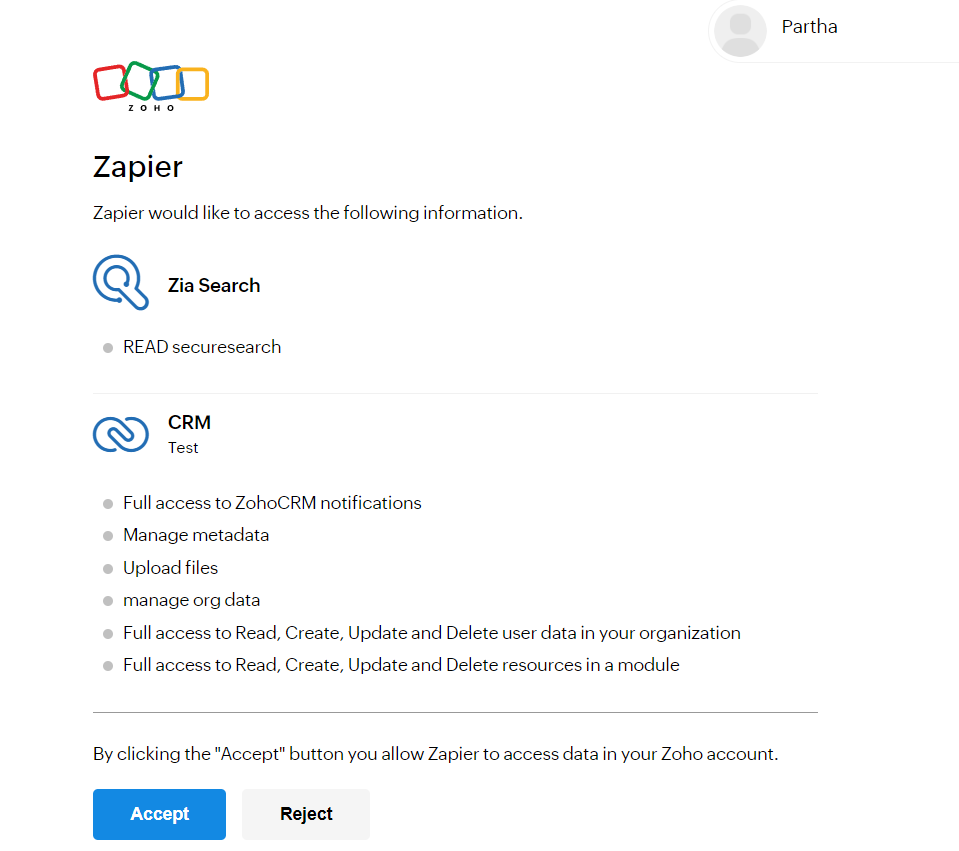 4. Zapier might need a few Permissions, click on Accept (refer screenshot below)
