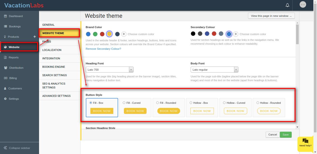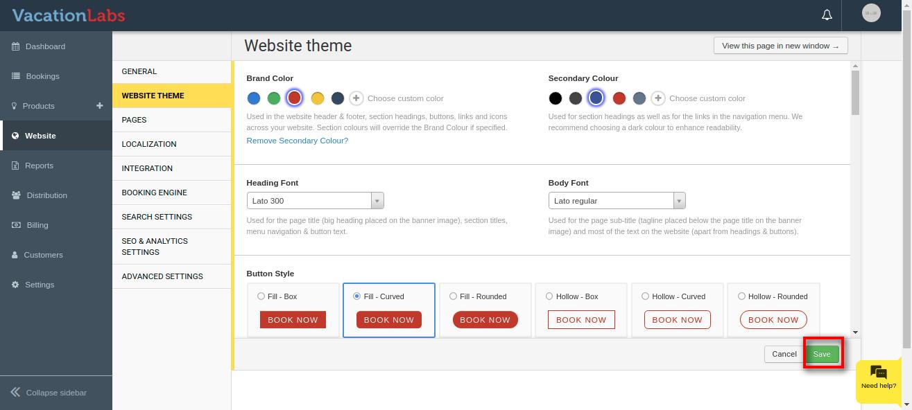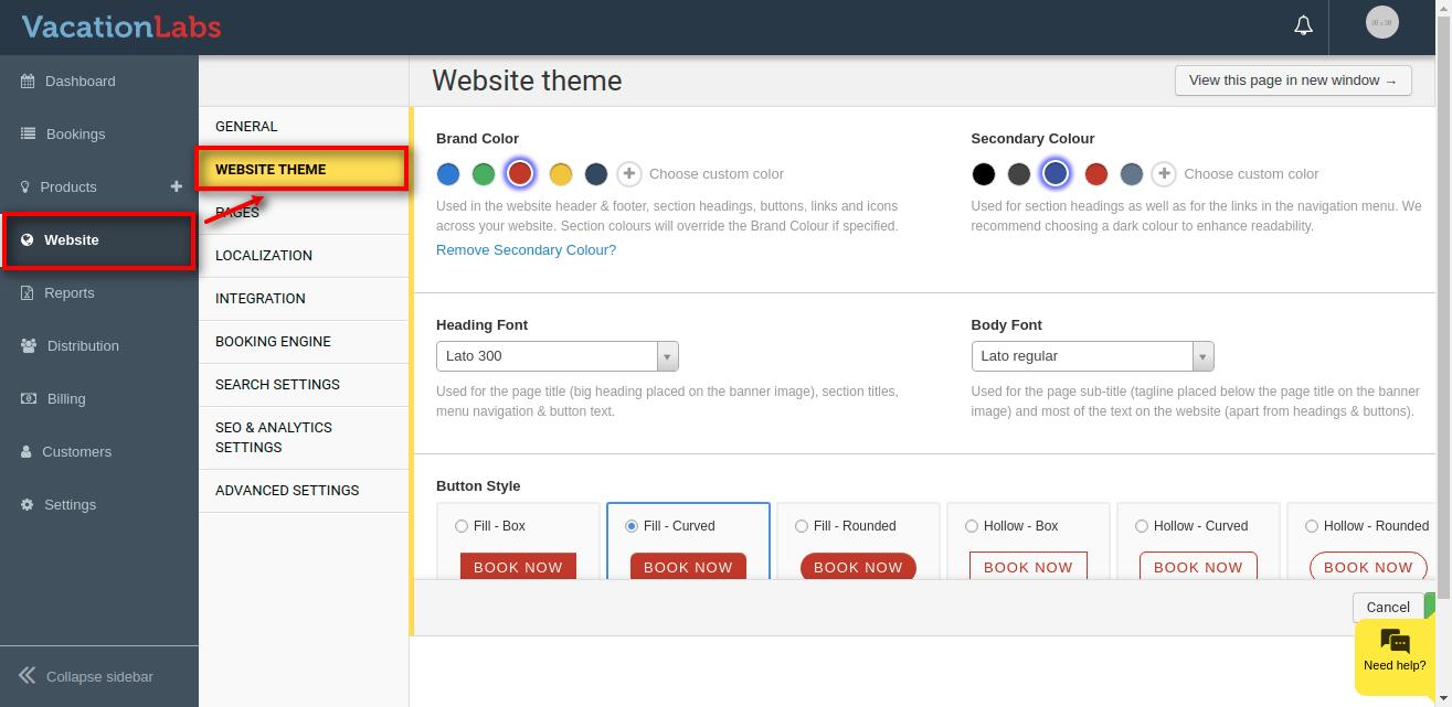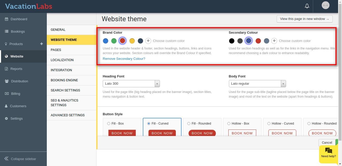 Colours play an important role in your website theme and its brand recognition and highlight important website elements and influences how people feel about a website. Vacation Labs website builder allows you to have 2 sets of colour i.e Brand Colour and Secondary Colour.