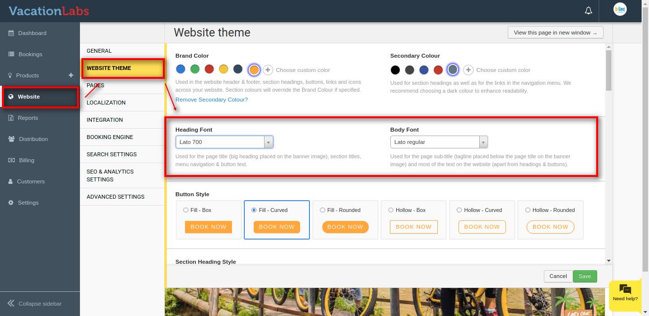 Vacation Labs website builder allows you to have 2 types of fonts i.e Heading Font and the Body Font for the website.