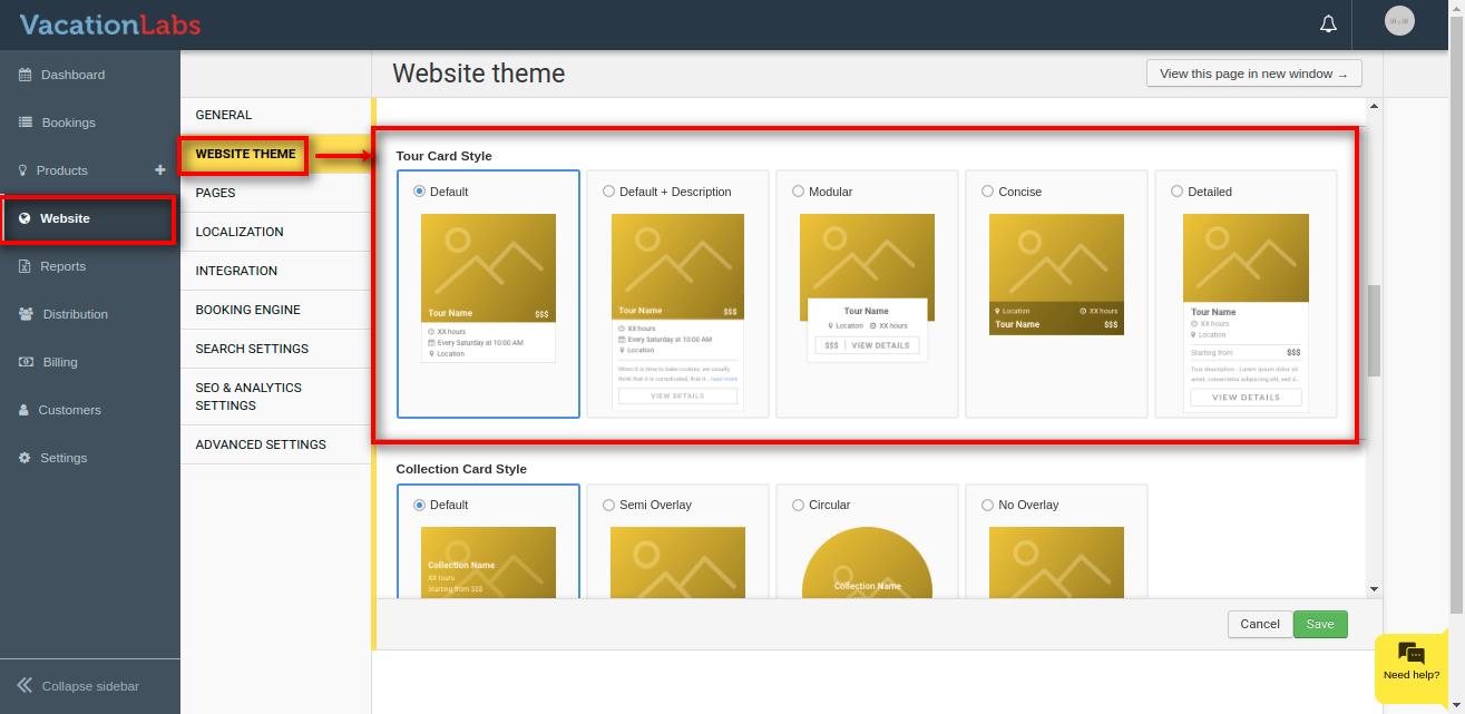 Vacation Labs website builder allows you total 5 types of Tour Card styles i.e Default, Default + Description, Modular, Concise, Detailed.