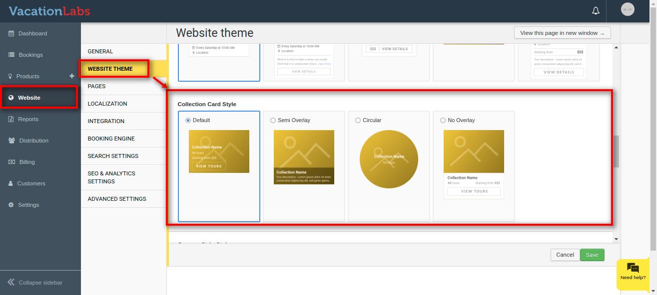 Vacation Labs website builder allows you to total 4 types of Collection Card styles i.e Default, Circular, Semi Overlay, No-overlay.