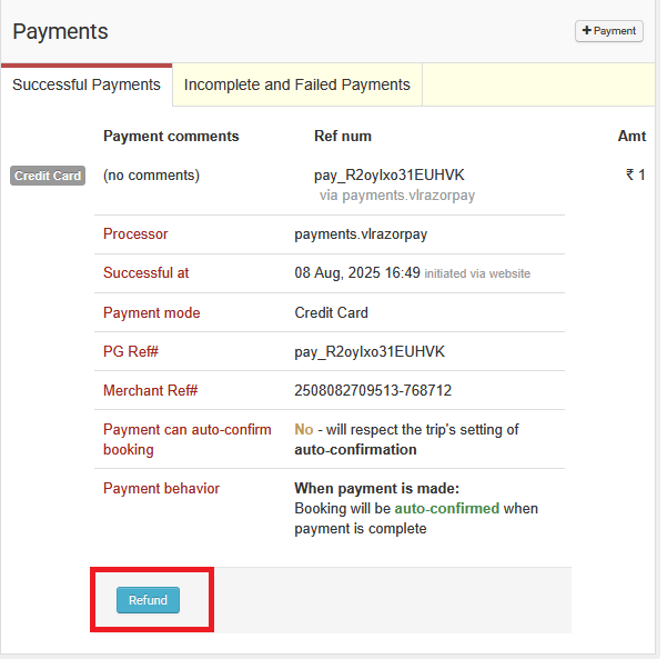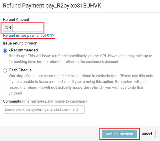 Here, you can either refund a partial amount by entering the desired value, or refund the entire amount by clicking the “Refund entire payment of ₹X?” button to autofill the full amount and click Refund Payment button.