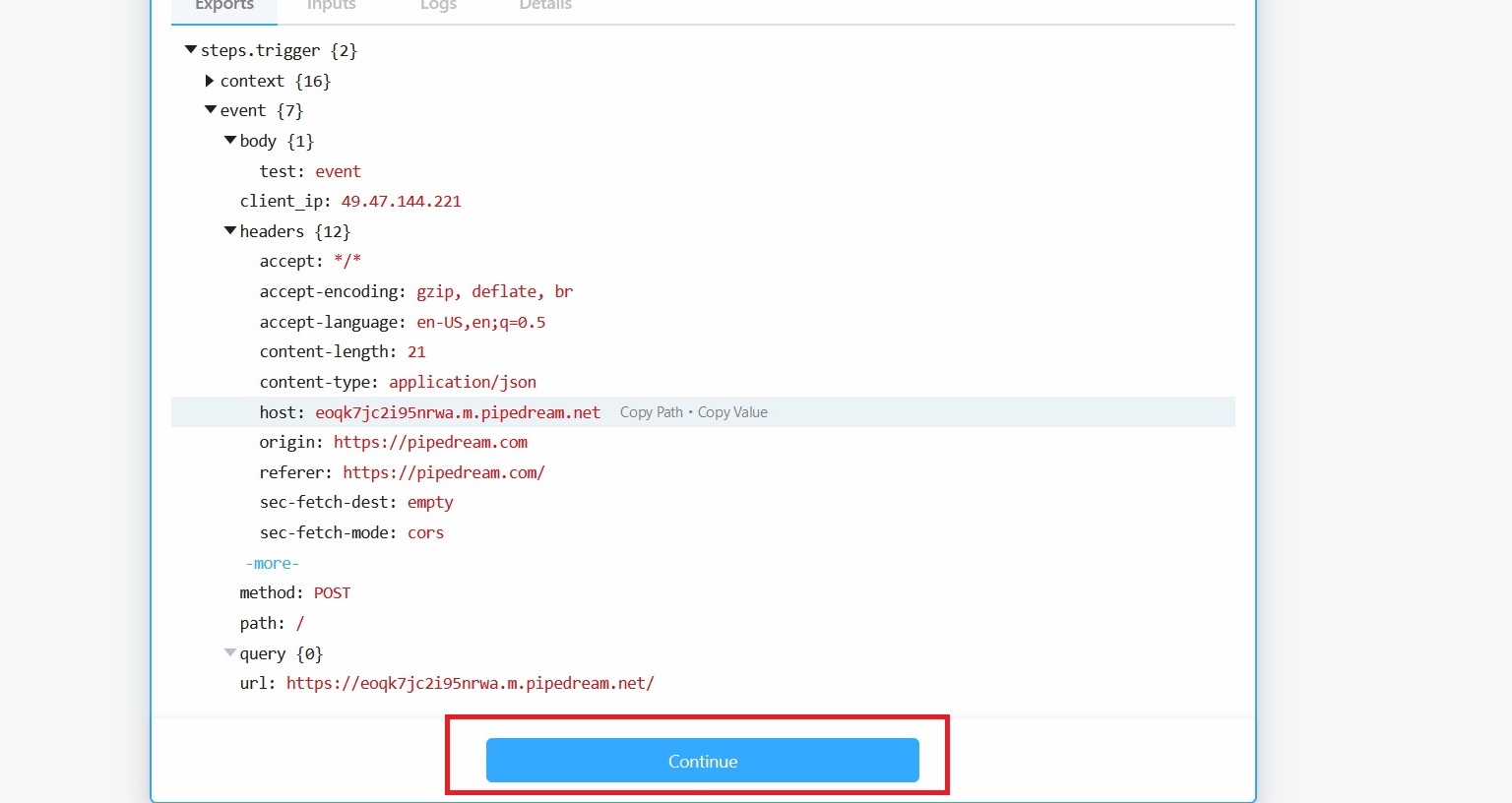 Once VL has set it up as a webhook, you can click on Generate test event and then click on Continue (refer screenshot below)