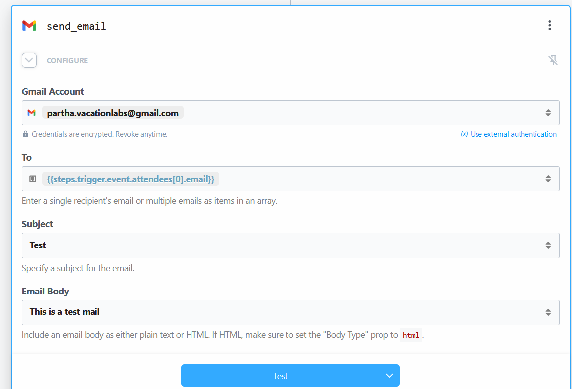 - Select the TO email from the dynamic payload (the customer email will be included in the trigger payload) and customize other aspects of the mail as well such as Subject, Body, CC, BCC etc (refer screenshot below)