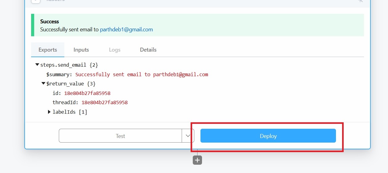 - Once the test has run successfully you can click on DEPLOY to make the workflow live (refer screenshot below)