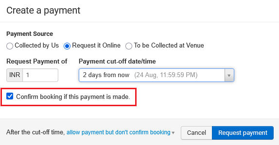 (Optional) If the booking is in an Unconfirmed state, check Confirm booking if this payment is made so the booking automatically updates to Confirmed once payment is received.