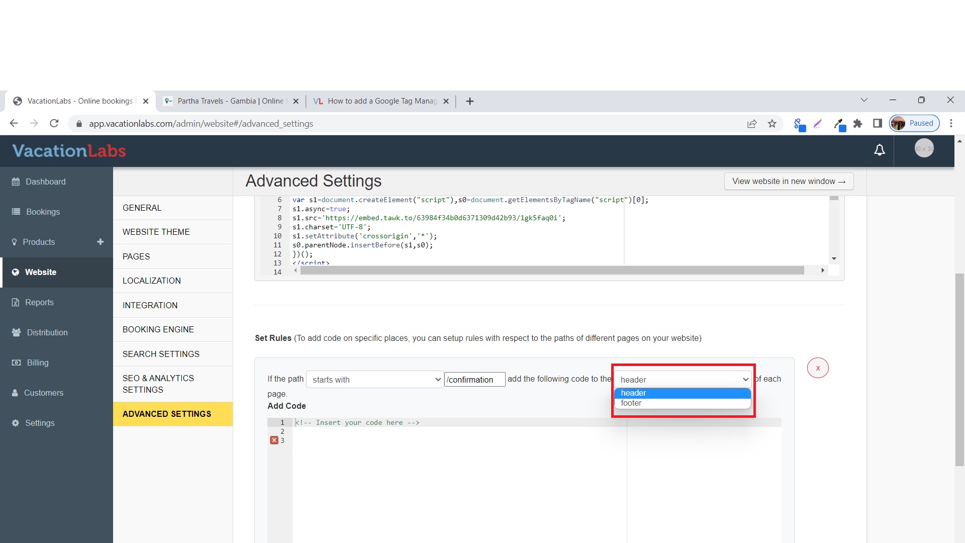 4. You can control if you want to paste the code in the HEADER or FOOTER (if specified by the provider of the code) of the page as well