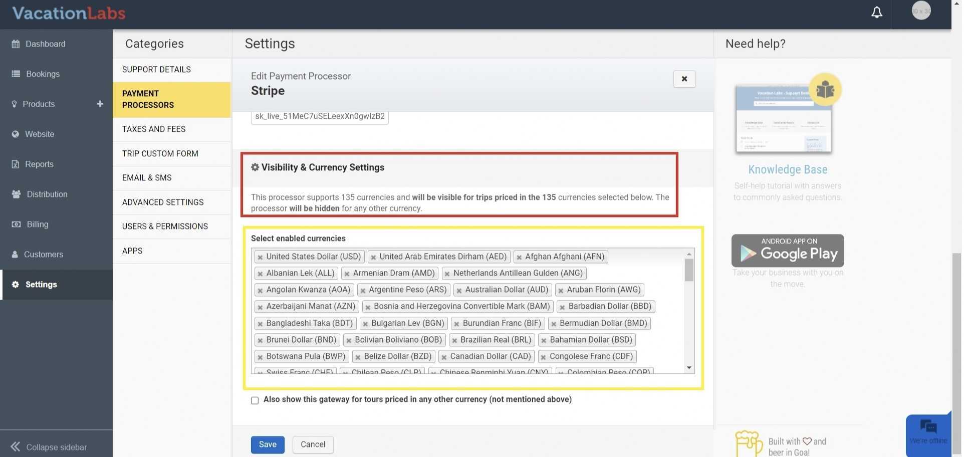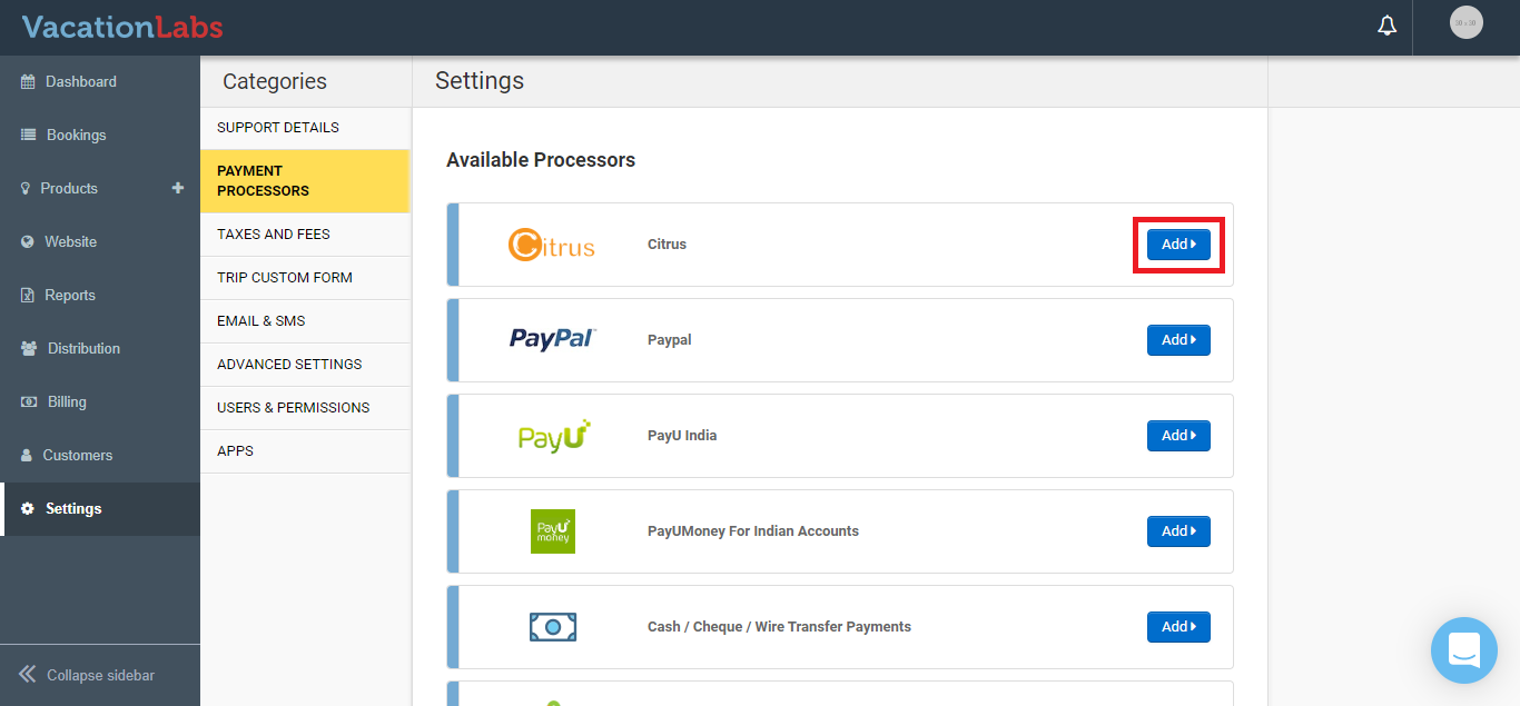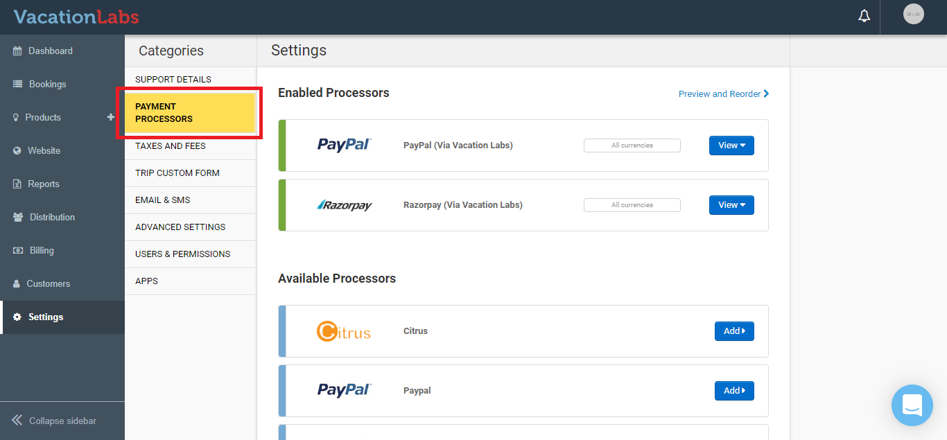 To enable a payment gateway, log in to your Vacation Labs Admin Panel and go to Settings > Payment Processors.