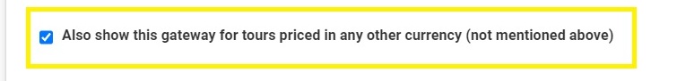 If you offer tours priced in currencies not supported by a payment processor, you can still enable it by selecting the option “Also show this gateway for tours priced in any other currency.” In such cases, you’ll need to choose the currency in which the customer will pay. For example, if a tour is priced in euros (a non-supported currency), you can configure the processor so that the customer pays in USD.