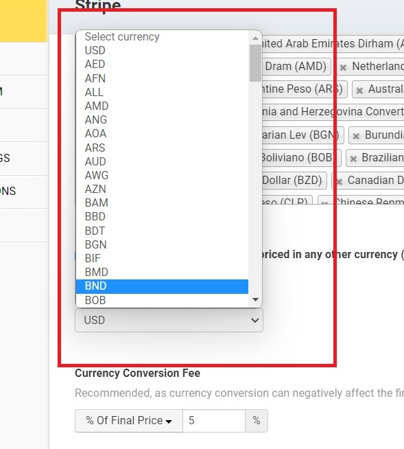 Additionally, you can configure a Currency Conversion Fee**,** either as a percentage of the final price or a fixed amount.