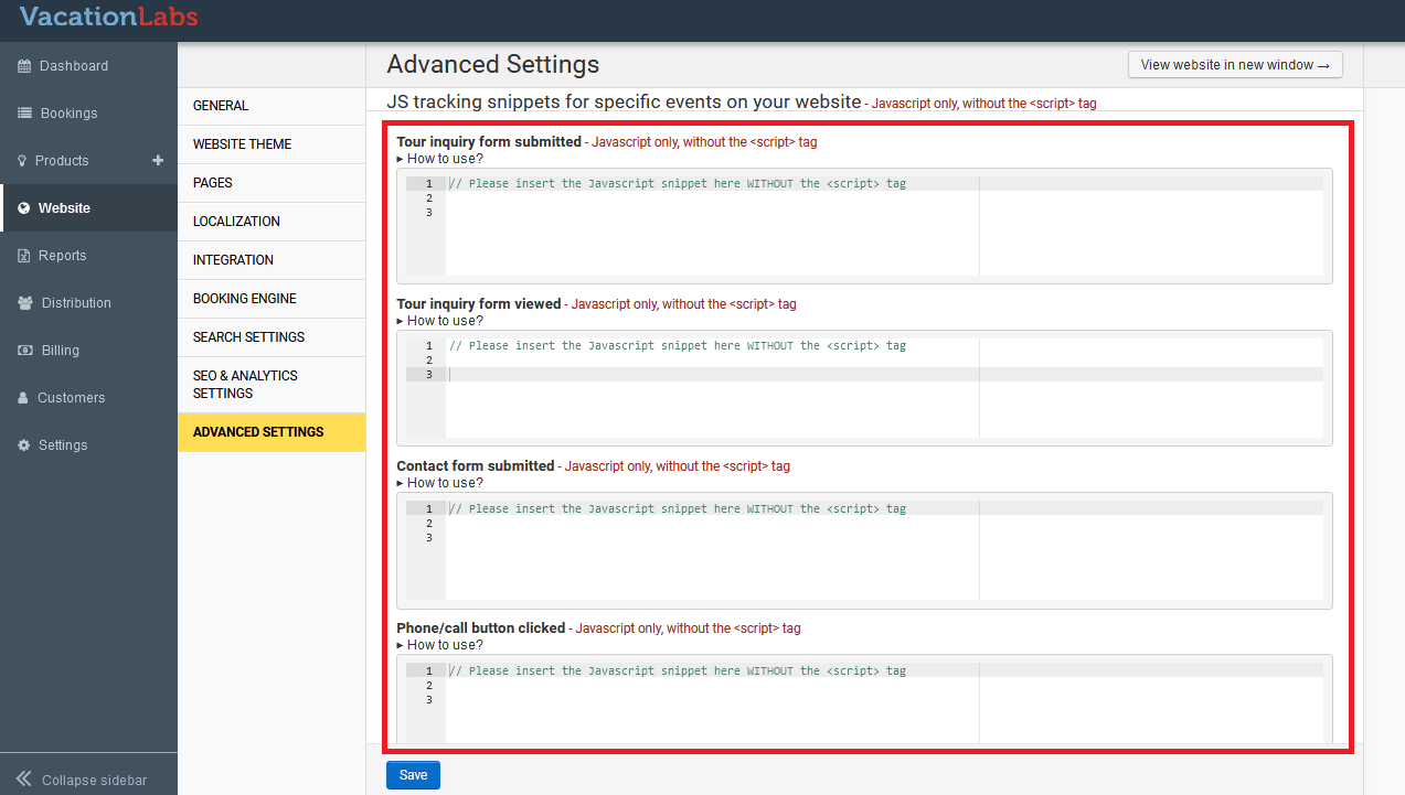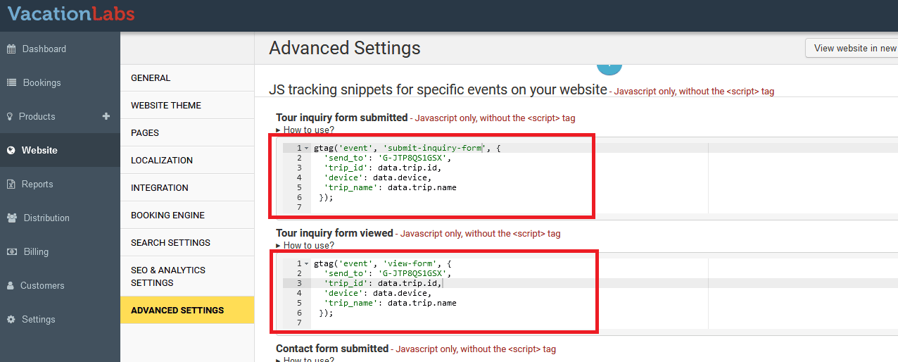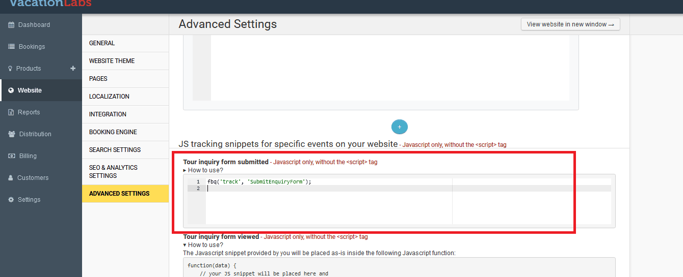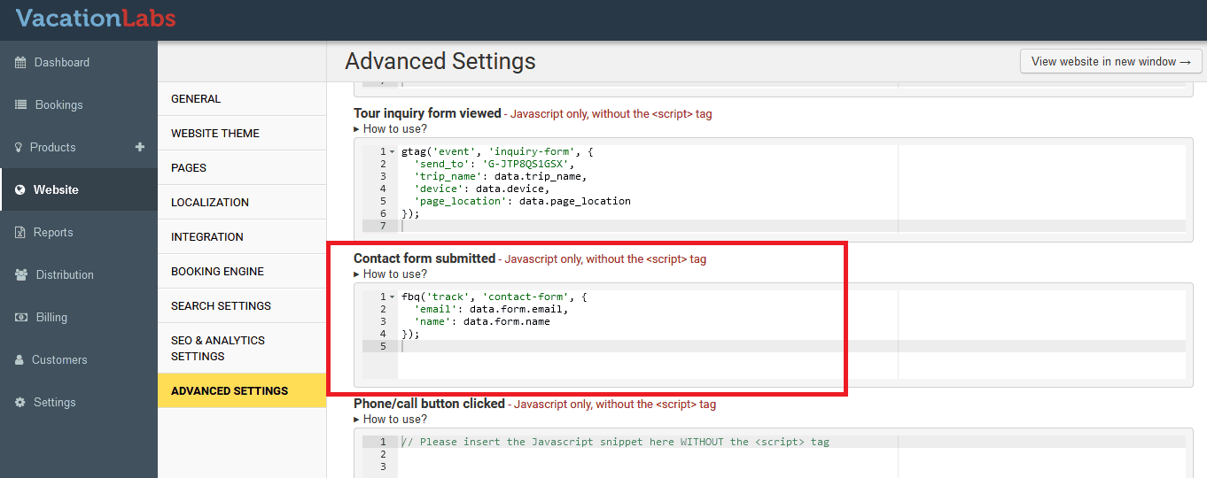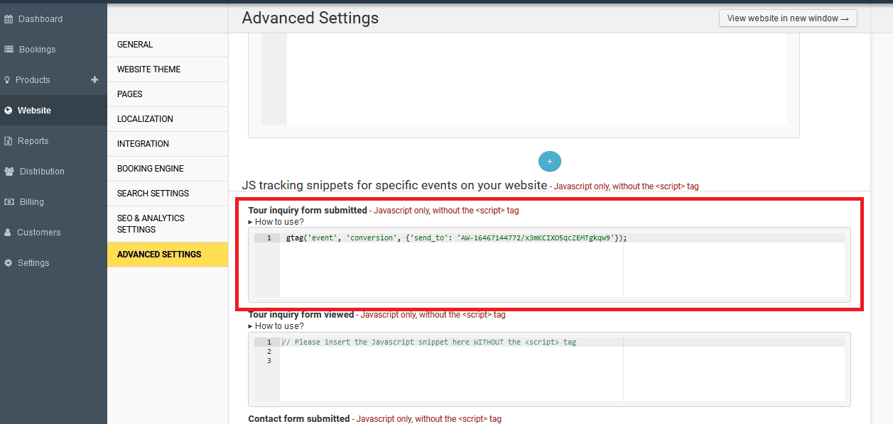 To setup tracking codes for these events, navigate to Website > Advanced Settings > Scroll down to “JS Tracking Snippets” section.