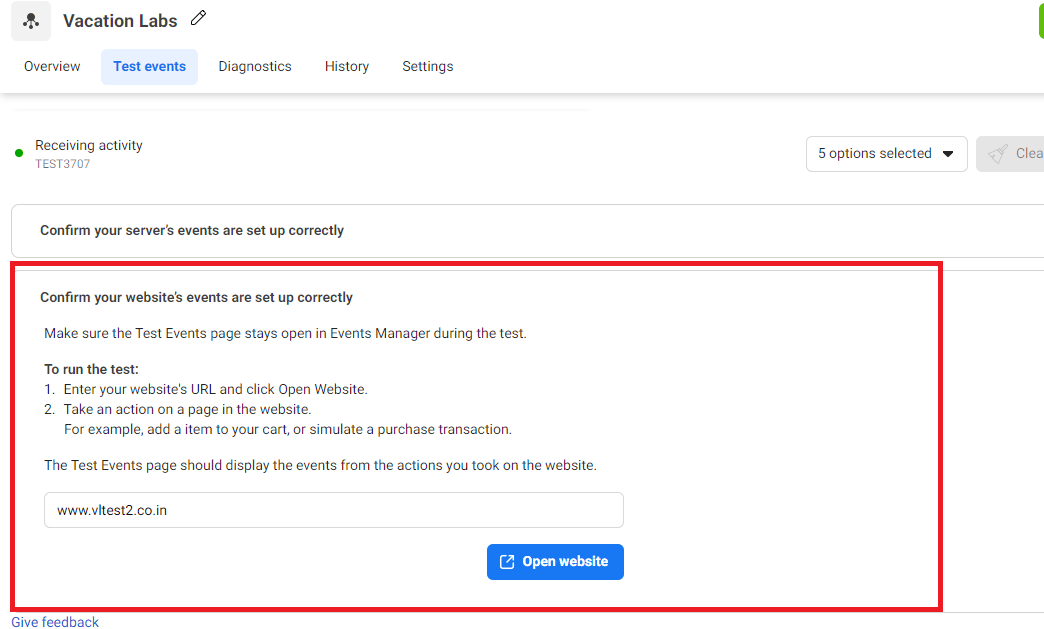 Also, you can verify by using Test Events. Click on ‘Test Events’, then click on ‘Confirm your website’s events are set up correctly’. Add your domain, and click on ‘Open website’.