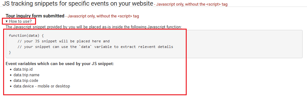 Each JS snippet has a How to use section where you can view more details about what variable are available for use in your JS tracking snippet.