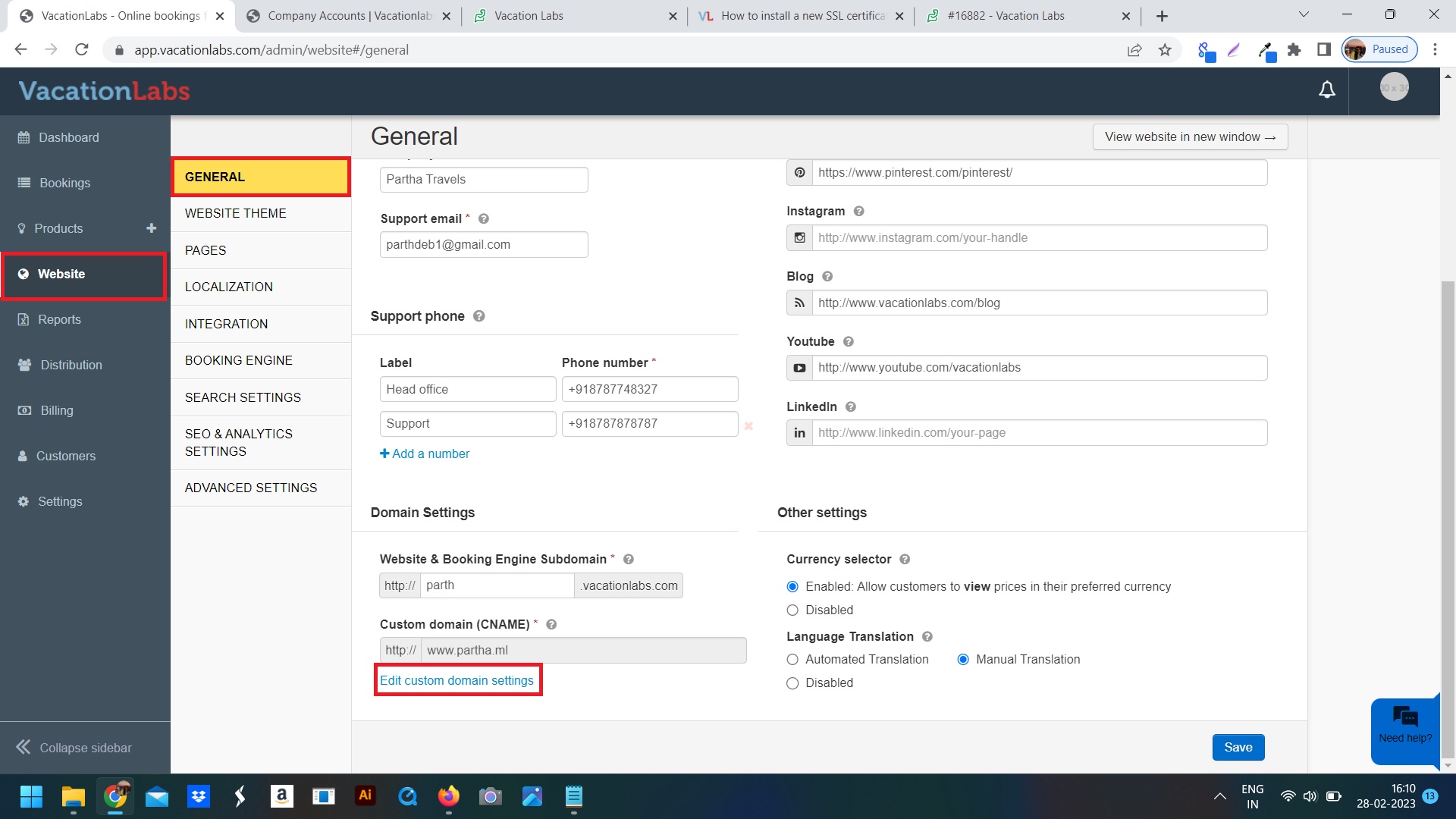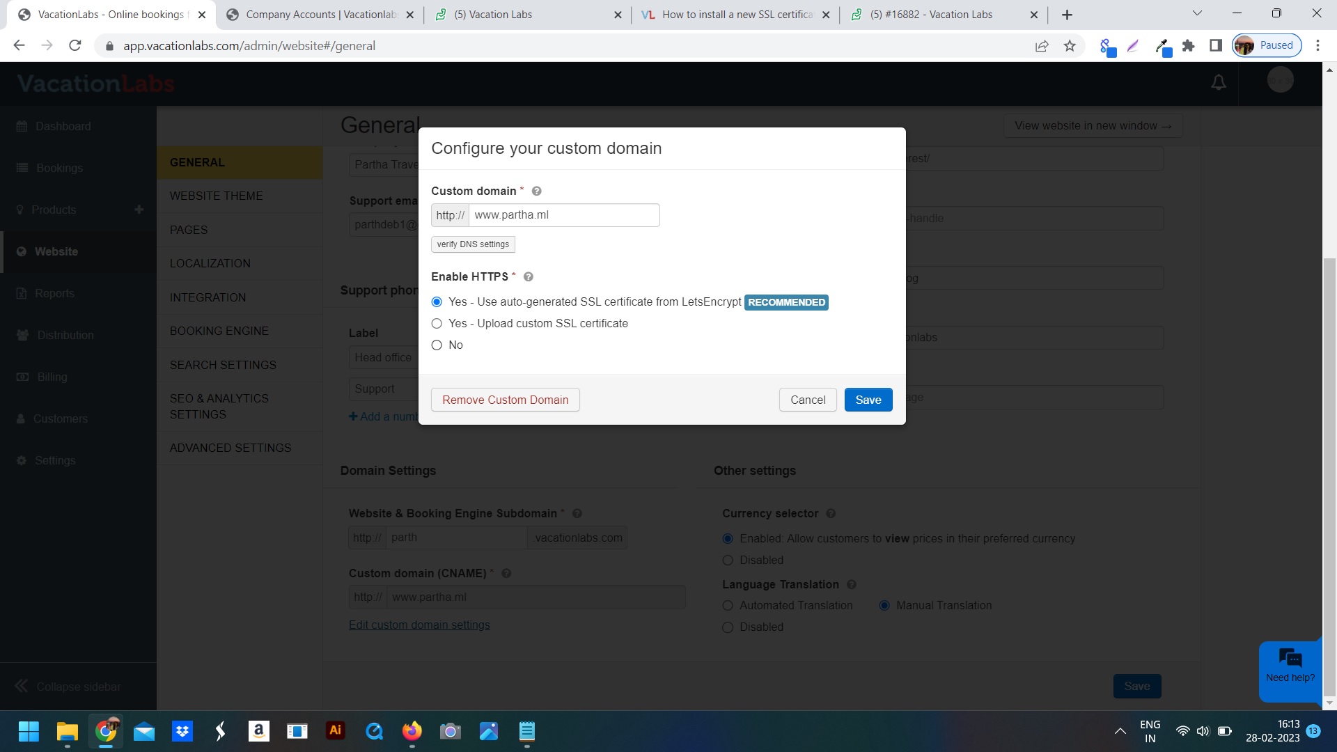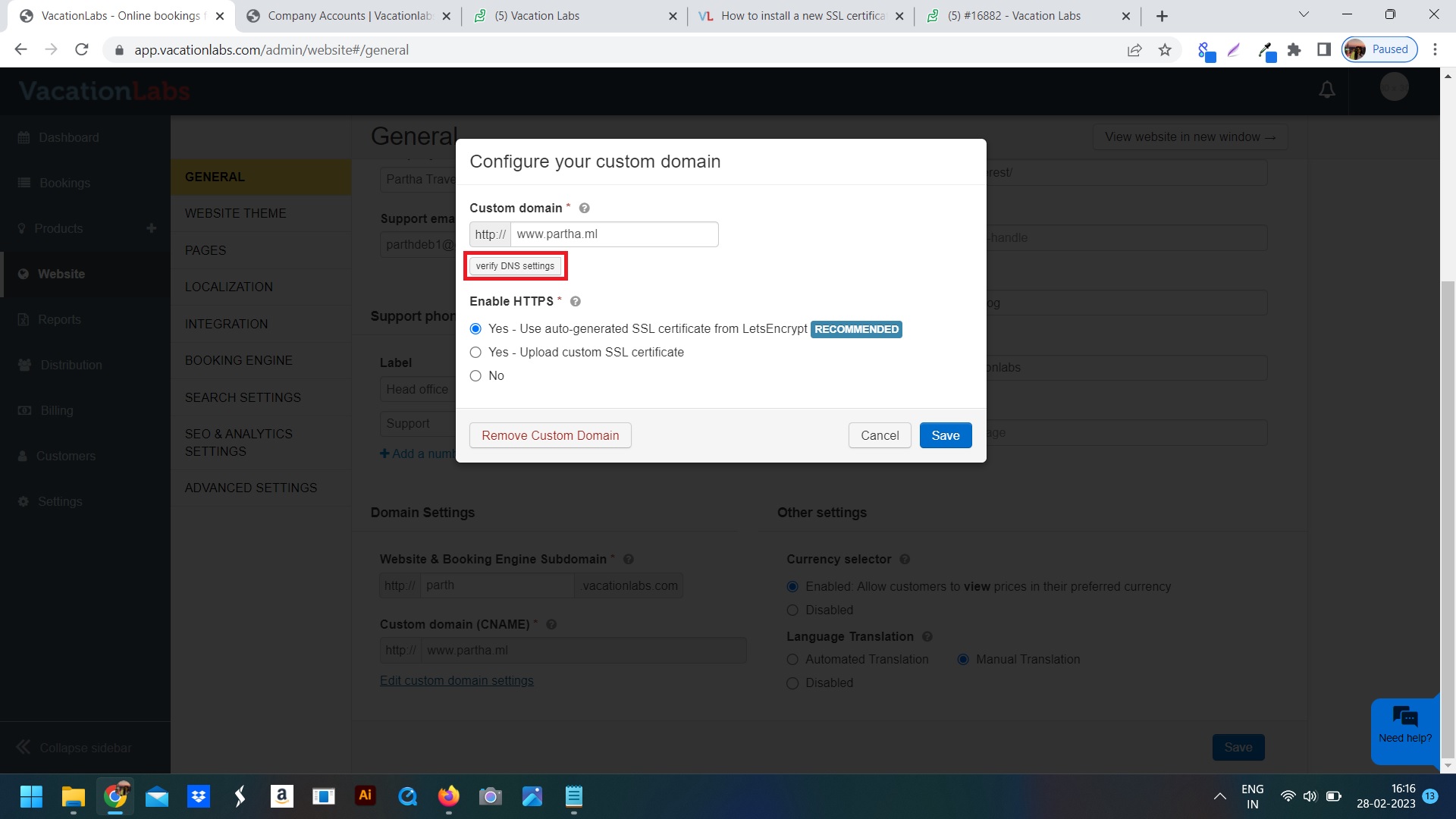- You must have a custom domain (e.g., www.yourstore.com) already correctly configured and pointing to your Vacation Labs storefront. The DNS must be verified before you can enable SSL.