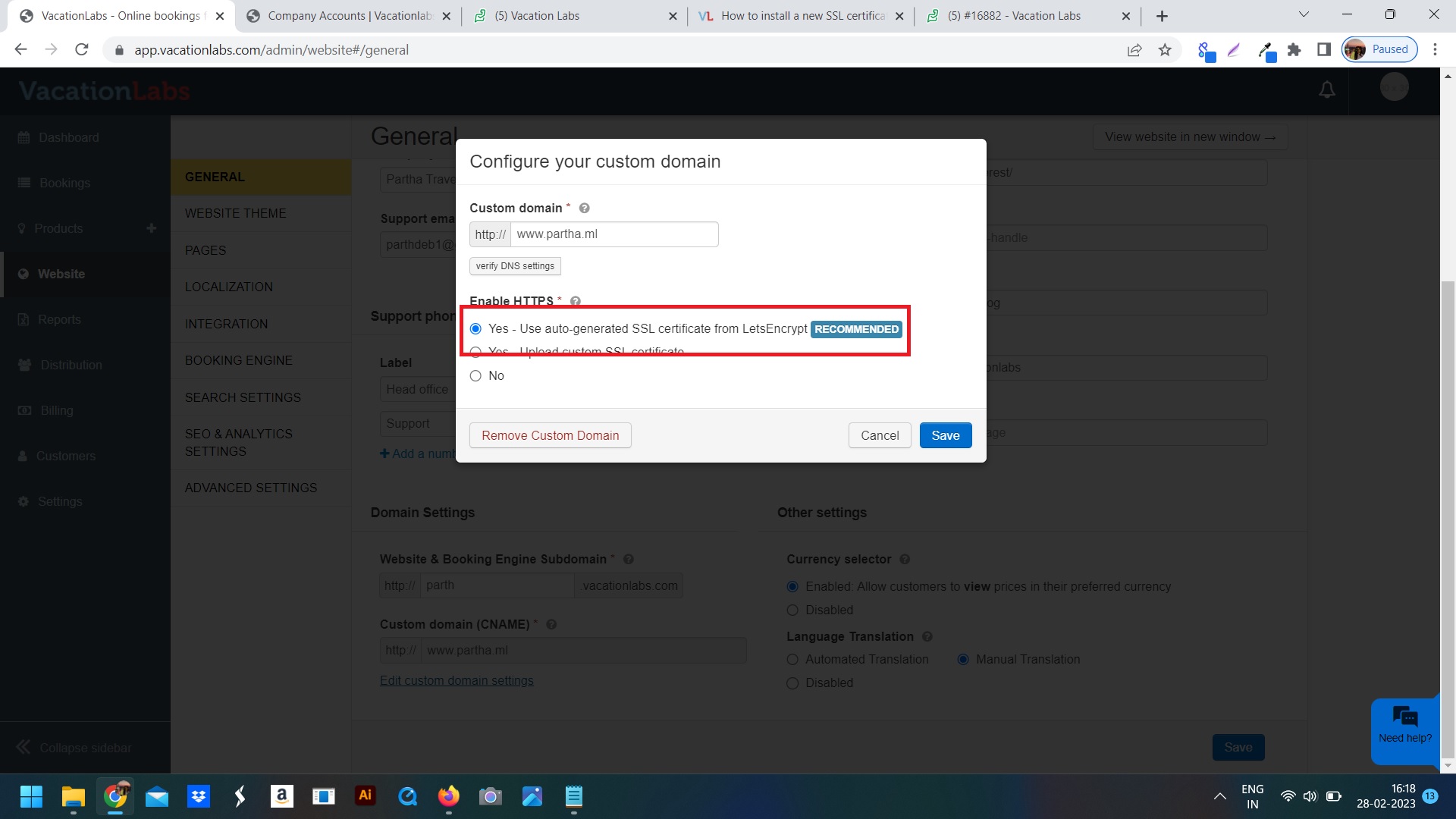 Configuring the Let's Encrypt SSL Certificate on your Vacation Labs website