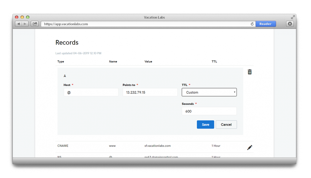 Next, we need to add a CNAME for www.yourdomain.com which points to sf.vacationlabs.com